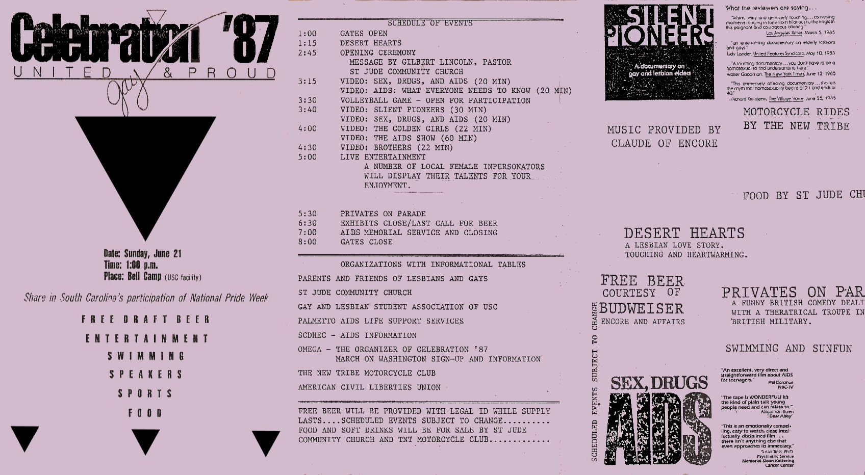 June 23, 1990, �TNT�, along with members of several North Carolina & Georgia, BDSM/leather groups, participated in the First Annual SC Gay & Lesbian Pride March, held in Columbia, SC. Most did so in full leather gear. The Parade Committee, (myself being a co-chair), recruited some of our folks to be the color guard for the front of the march. The US, South Carolina and Pride flags, all carried by several of our lifestyle community members. This leather-clad color guard was a tradition through to the May 2, 1998, march in Myrtle Beach. http://www.scglpm.org/index.html |