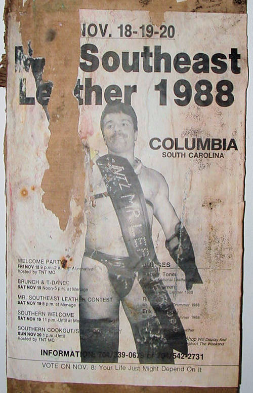 | November, 18 - 20, of 1988, �TNT M/C�, along with Robert Sheets, co-sponsored the first leather event here, �Mr. SouthEast Leather, (S.E.L.) 1988� contest, and a preliminary to �Int�l Mr. Leather 1989�, (IML), in Chicago, (nowadays, a well-known contest), held at a bar called �M�nage�, the big disco. The weekend started with a �Welcome Party� on Friday night, held at �Alternatives�, the non-disco, smaller bar on Gervais St, (over the Palace Restaurant). |